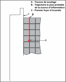 - Vu la séquence des événements, la proximité des travaux de soudage par rapport au premier foyer d'incendie ainsi que la profondeur à laquelle le foyer se situait (à quatre plans de fardeaux en contrebas du plan de fardeaux du dessus), il y a une grande probabilité que le feu ait été allumé par des projections de soudage.
