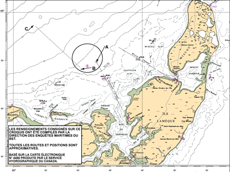 Le jour suivant, le 28 octobre, le remorqueur avec le chaland en remorque reçoit de nouvelles prévisions météo qui annoncent des vents du sud-est devant varier de modérés à vents de tempête. Le remorqueur avec le chaland en remorque change alors de cap pour aller s'abriter derrière l'île Miscou (Nouveau-Brunswick). Vers 18 h 50, les bâtiments arrivent à environ 7 milles au nord de Bas-Caraquet (Nouveau-Brunswick) (voir Figure 1, position A). Afin de manœuvrer à l'intérieur d'une zone au large de Bas-Caraquet (voir le cercle, Figure 1), l'équipage juge alors utile d'effectuer une manœuvre qui consiste à remonter dans le vent pour changer de cap et fuir avec le vent.