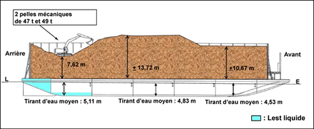 - deux pelles mécaniques utilisées pour le déchargement, pesant respectivement 47 tonnes et 49 tonnes, ont été arrimées sur la cargaison vers l'arrière du chaland, à une hauteur supérieure à 7 m au-dessus du pont;