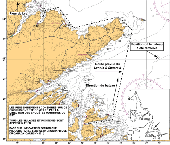 Le 15 septembre 2006 vers 16 hNote de bas de page 2 , le Lannie & Sisters II appareille de Fleur de Lys (Terre-Neuve-et-Labrador) avec un équipage de cinq personnes pour un voyage de pêche au maquereau devant durer toute la nuit. Vers 0 h 30 le lendemain, le capitaine reçoit l'ordre du propriétaire, qui pêche à bord d'un autre bateau, de rentrer au port car l'équipage au complet a été congédié. L'équipage ramène le Lannie & Sisters II à Fleur de Lys, où deux membres d'équipage débarquent. On laisse également à terre une embarcation de 3,3 m. Avec les membres d'équipage qui restent, le bateau entreprend le voyage de 60 milles marins qui l'amène à Lushes Bight, de l'autre côté de la baie Notre Dame (voir Annexe A). Le 16 septembre 2006 à 21 h 30, le bateau arrive à Lushes Bight où le matériel suivant est débarqué :