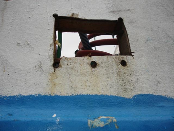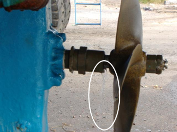Le Lannie & Sisters II est muni d'un presse-étoupe au bout extérieur de l'arbre porte-hélice; ce presse-étoupe laisse fuir de l'eau depuis un certain temps et se détériore graduellement (voir Photo 4). À Lushes Bight, les membres d'équipage branchent le bateau à la prise d'alimentation à quai pour éviter que la pompe d'assèchement ne décharge la batterie pendant qu'ils sont à la maison.