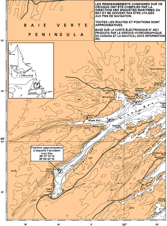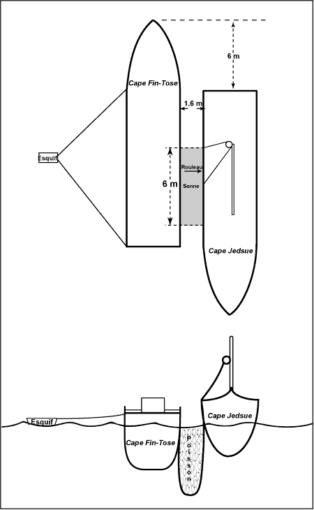 Le 31 octobre 2006 vers 16 h 30Note de bas de page 4, le petit bateau de pêche Cape Fin-Tose part du quai des propriétaires du bateau, à King's Point (Terre-Neuve-et-Labrador), avec à son bord un équipage de six personnes, pour aller faire la pêche du maquereau dans Green Bay (Terre-Neuve-et-Labrador). Vers 1 h le 1er novembre, le bateau commence à pomper le maquereau du premier jeu de filets pour l'envoyer dans sa cale à poisson. Une fois cette opération terminée, l'équipage range les engins, nettoie l'aire de travail et prépare le jumelage avec un autre petit bateau de pêche, le Cape Jedsue, dont il doit récolter les prises de maquereau. Vers 5 h 30, le Cape Fin-Tose se place à couple, proue sur poupe, avec le Cape Jedsue, la senne du Cape Jedsue placée entre les deux bateaux, et il fixe l'amarre avant du Cape Jedsue à son pavois tribord, sur le pont principal. Le Cape Fin-Tose se sert de son esquif à moteur, manœuvré par un membre de l'équipage, pour maintenir les deux bateaux à une certaine distance l'un de l'autre et pour les maintenir au centre de la baie (voir la figure 1).