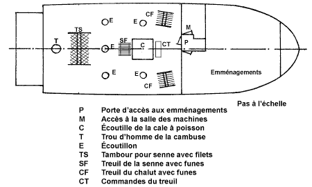 - que, pour la pêche à la senne, les deux soutes à combustible du compartiment moteur soient les seules à être remplies. Les deux soutes à combustible de la cambuse doivent être vides (Notes au capitaine du livret de stabilité - 4A); et
