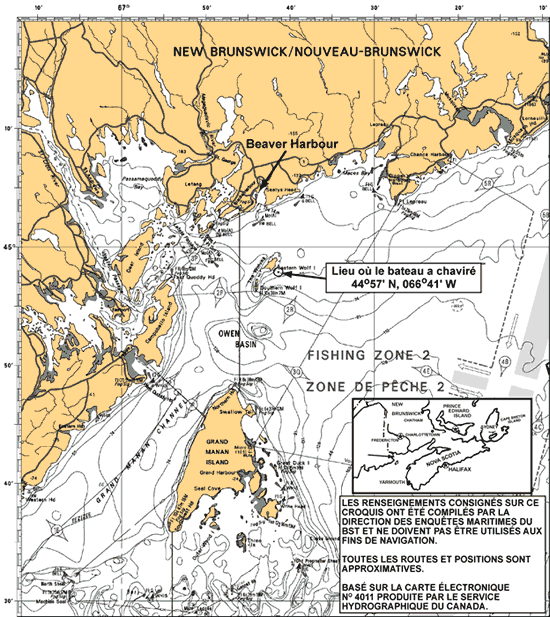 Le 13 novembre 2007 à 6 h 5Note de bas de page 2, le Big Sister, avec le propriétaire à la barre et trois membres d'équipage, appareille du port de Beaver Harbour, au Nouveau-Brunswick (N.-B.) pour se rendre à l'archipel des Loups situé à 7 milles de là, dans la baie de Fundy (N.-B.) (voir l'Annexe B). Avant le départ, les bouchons de dalot ont été mis en place car le franc-bord est limité à environ 30 pouces (0,763 m) entre la flottaison et le sommet des plats-bords. Quelque 140 casiers à homard, pesant environ 27 kg chacun, ont été chargés à bord. L'équipage compte les mettre à l'eau le jour de l'ouverture de la saison de pêche au homard. Les casiers sont empilés en blocs (5 de haut, 5 de large et 5 de long). De plus, 10 casiers ont été placés sur la plateforme arrière et 4 autres près de la porte de la timonerie.