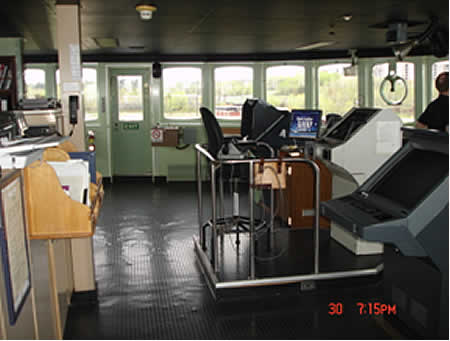 Le poste de barre est situé sur une plateforme surélevée au milieu de la passerelle, ce qui permet au timonier d'avoir une bonne visibilité vers l'avant tout en étant à proximité des indicateurs de cap et d'angle de barre.