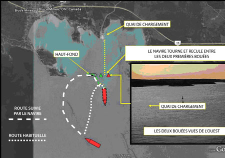 Le chenal qui conduit aux installations de l'Ontario Trap Rock est balisé par des bouées entretenues à titre privé; quelques-unes sont lumineuses. Les bouées de bacirc;bord et de tribord qui balisent l'entrée du chenal sont situées à l'est du haut-fond signalé sur la carte ougrave; le navire s'est échoué. De plus, un alignement lumineux orienté au 000° conduit au poste à quai; deux autres feux (un feu fixe situé près de l'île McKay, et le feu du quai public de Bruce Mines) auraient été visibles aux distances respectives de 15 M et 8 M.