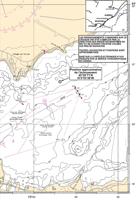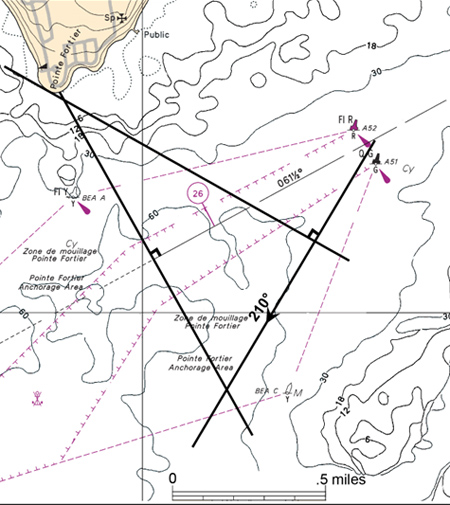 réglé en fonction du cap modifié vers la gauche, à 210°. Cette modification par rapport au parcours normal dans la zone de mouillage signifiait que le relèvement par rapport à la Pointe Fortier aurait lieu beaucoup plus tôt qu'à l'habitude (voir la Figure 2).