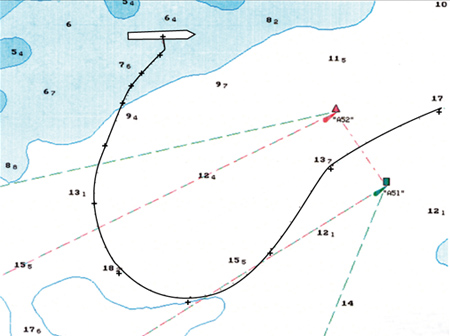 Pour la traversée de la zone de mouillage vers l'écluse inférieure (aval) de Beauharnois, le pilote surveillait habituellement la progression du navire au moyen d'un relèvement par le travers orienté sur la Pointe Fortier. Il ciblait cet emplacement en réglant l'alidade électronique (ELB) du radar à 90° par rapport au trajet du navire (généralement 235° V au centre du canal). Dans le cas de cet événement, toutefois, le relèvement par le travers était