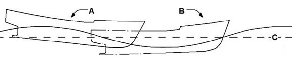 - si le bateau pique légèrement du nez et si la crête de la vague est sur l'arrière du milieu du bateau.