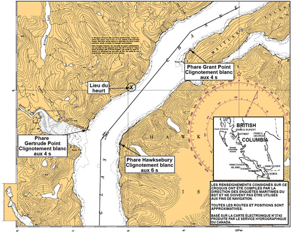 La carte à l'annexe B montre le secteur de l'événement et la position de chaque moment clé, ainsi que l'information relative au cap, à la route et à la vitesse. À l'annexe C, on trouvera une représentation graphique du cap et de la vitesse angulaire de gyration du navire pendant la durée de l'événement.