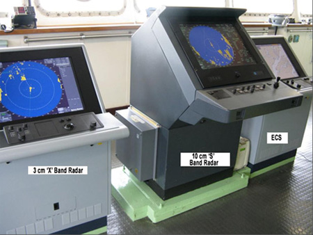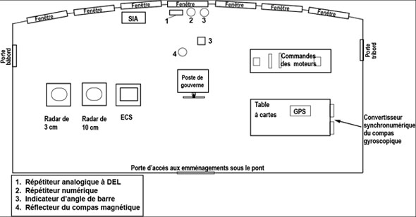 Du côté bâbord de la passerelle, on trouve côte à côte 2 radars à aide de pointage automatique — un radar de 3 cm et un radar de 10 cm — et un système de cartes électroniques (ECS) (voir la figure 1).