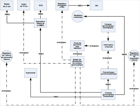 En avril 2009, on a remplacé le radar de 3 cm et l'ECS par des appareils neufs. On a réglé le convertisseur synchronumérique de façon à ce qu'il fournisse un signal de cap numérique à ces équipements qu'on venait d'installer, mais le convertisseur continuait d'envoyer un signal de cap analogique à l'ancien radar de 10 cm et à 4 des 5 répétiteurs.