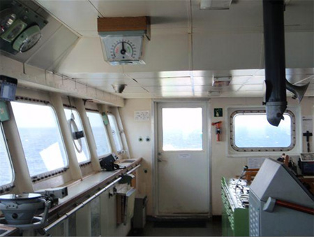 Les autres équipements de navigation comprennent 2 gyro-compas Note de bas de page 2, 3 récepteurs de système de positionnement global (GPS), un système d'identification automatique (AIS), un enregistreur de cap, un enregistreur simplifié des données de voyage (S-VDR) et un sondeur. Au total, on compte 5 répétiteurs de gyro-compas : un répétiteur numérique placé à l'avant, à peu près sur l'axe, un répétiteur analogique à DEL monté au-dessus de la fenêtre sur l'axe, un répétiteur analogique sur chacun des ailerons de passerelle bâbord et tribord, et un répétiteur analogique installé au poste de barre. Le réflecteur du compas magnétique et l'indicateur d'angle de barre (l'un étant monté au plafond et l'autre au-dessus de la fenêtre centrale) sont aussi visibles à partir du poste de barre.