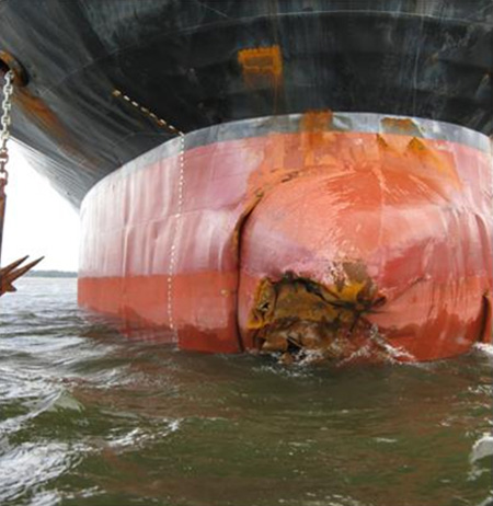 Une inspection sous-marineNote de bas de page 17 a révélé que la coque avait été percée vis-à-vis du coqueron avant et que l'étrave à bulbe avait été enfoncée entre les membrures 227 et 238, de la marque de tirant d'eau de 8 m jusqu'à 6 m plus bas, surtout du côté tribord.