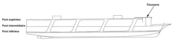rapport largeur-profondeur élevé. Il comporte 3 ponts (voir l’annexe B). Les ponts inférieur et intermédiaire sont réservés aux passagers, tandis que le pont supérieur abrite les engins de sauvetage, un poste de ravitaillement en carburant et des réservoirs d'eau potable. Le pont intermédiaire comporte une passerelle protégée par des rambardes. Le navire est propulsé par 2 moteurs diesel comportant des gouvernes de direction et des hélices jumelles, et sa proue est dotée de 2 ancres. La coque principale est divisée par 7 cloisons transversales.