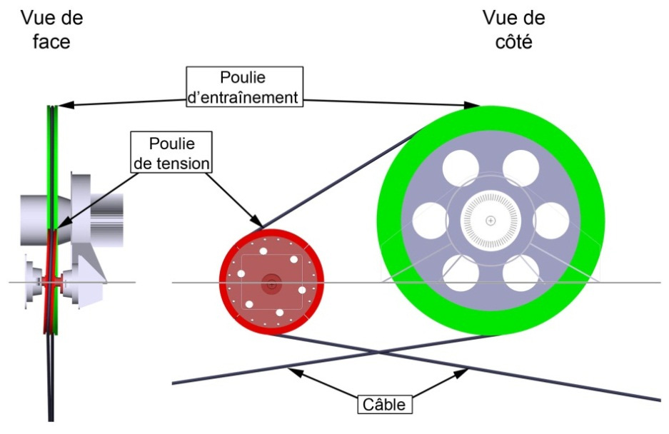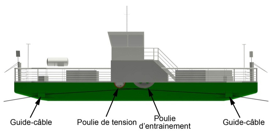 À l'extrémité nord du traversier et de chaque côté de celui-ci, les câbles passent par des guides–câbles à rouleaux installés sous la ligne de flottaison. Chaque câble remonte ensuite sous le pont latéral en porte-à-faux, s'enroule sur la poulie d'entraînement et la poulie de tension, puis redescend sous le pont latéral et ressort par le guide-câble, placé sous la ligne de flottaison, à l'extrémité sud du traversier. Les poulies de tension installées de chaque côté du traversier sont inclinées vers l'extérieur à un angle d'environ 2,5° par rapport à la verticale, pour éviter que les 2 tronçons du câble n'entrent en contact. Cette disposition crée une boucle continue qui se déplace le long des câbles, à mesure que le traversier avance (Figure 2).