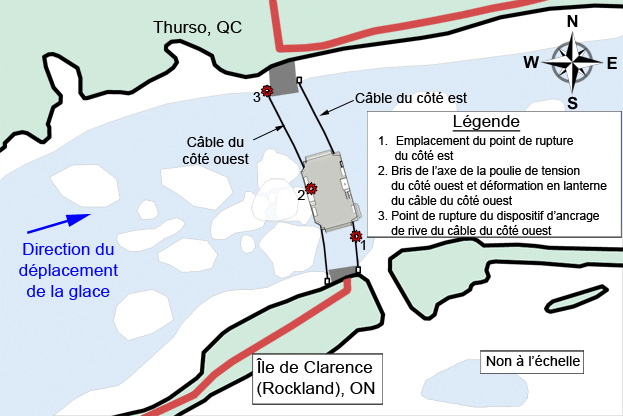 En raison de la tension élevée, le dispositif d'ancrage sur la rive nord s'est rompu. Ce dispositif ne présentait pas de défaillance préalable. Il a été trouvé dans la neige à environ 3 m du point d'ancrage, ce qui indique que le traversier a été soumis à des forces supérieures à la normale en raison de la poussée de la glace descendant la rivière.