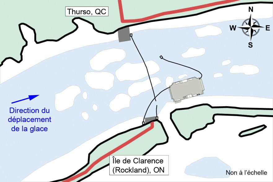 Le débit de la rivière des Outaouais varie selon les endroits, généralement à cause des variations de profondeur, des chutes et des rapides le long de la rivière. Le 9 décembre, le courant à Thurso était estimé à 1,2 noeudNote de bas de page 9, ce qui est dans les limites normalesNote de bas de page 10. Au moment de l'incident, la température de l'air mesurée par Environnement Canada était de −15 °C. La température moyenne pour la semaine précédente était de −5,7 °C. Des vents de l'ouest d'environ 15 km/h ont été enregistrés pendant la journée et la nuit.