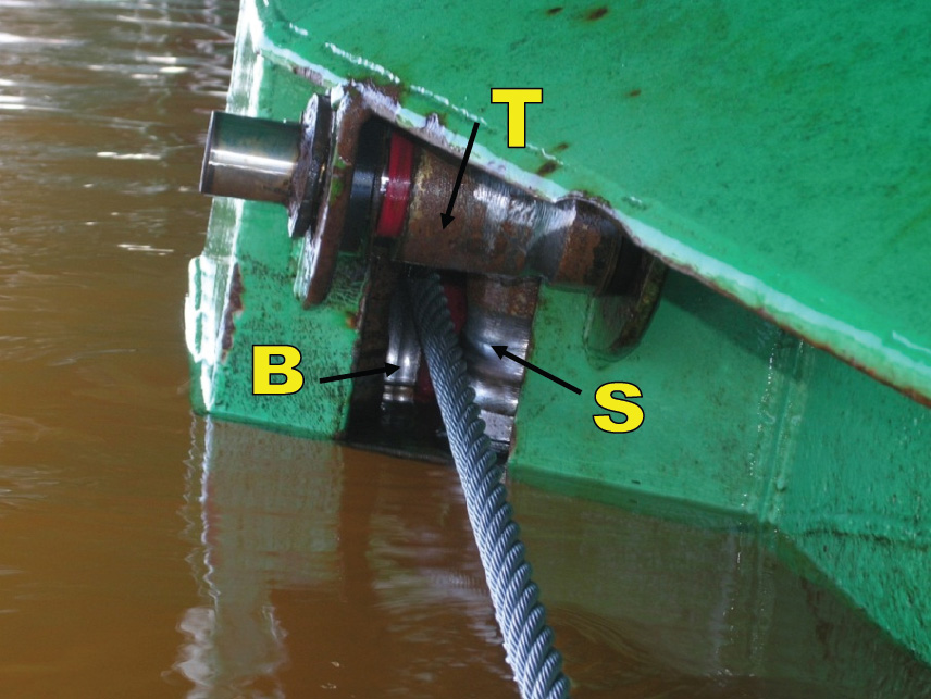 Dans le cas présent, le câble du côté est s'est rompu et est complètement sorti du mécanisme d'entraînement. Toutefois, le câble du côté ouest a été partiellement endommagé lorsque l'axe de la poulie de tension s'est brisé, mais il ne s'est pas rompu. La partie déformée en lanterne du câble est demeurée coincée dans le mécanisme d'entraînement situé du côté ouest, retenant le traversier le long de la rive.