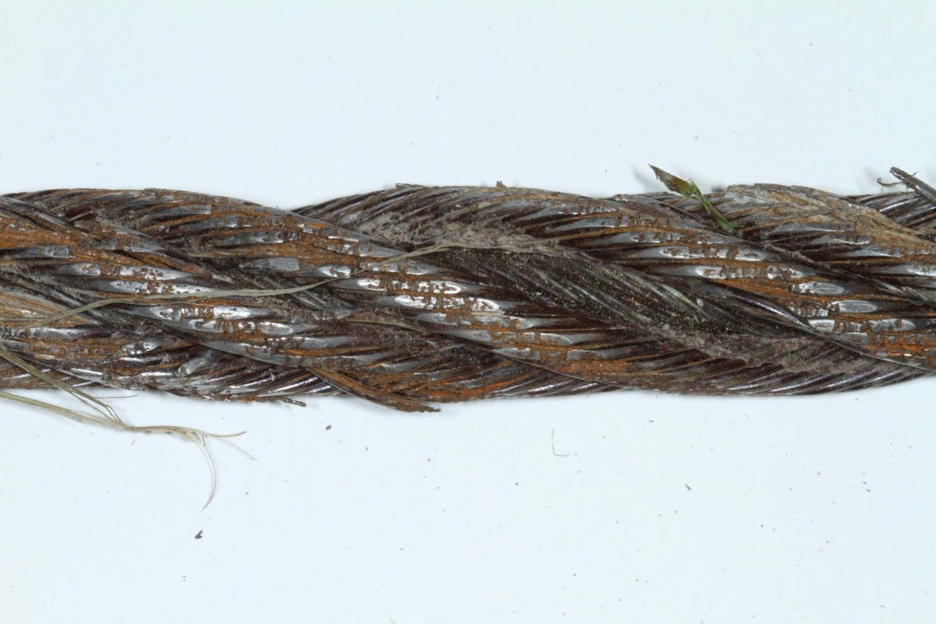 En août 2010, le câble du côté ouest avait été remplacé au milieu de la saison d'exploitation. Lorsque l'axe de la poulie tension s'est rompu, le câble du côté ouest n'était plus retenu par la poulie de tension. La tension sur le câble a augmenté lorsque celui–ci a fléchi contre la structure à faible rayon de courbure du pont, alors que le traversier était poussé vers l'aval par la force de la glace accumulée contre la paroi de la coque du côté amont. L'examen du câble a permis de démontrer que celui–ci ne s'était pas entièrement rompu, mais que des 6 torons extérieurs et du toron central, il ne restait que 3 torons extérieurs. L'examen des torons rompus a révélé la présence d'une rupture primaire causée par la traction. La résistance de 3 sections échantillons intactes du câble était égale ou supérieure à la résistance nominale du câble de 100 000 lbNote de bas de page 15. Le câble du côté ouest s'est replié sur lui–même lorsque les torons rompus se sont déformés en lanterne, ce qui se produit normalement sous l'effet d'une force de tension élevée. Le câble présentait peu de corrosion ou d'usure.