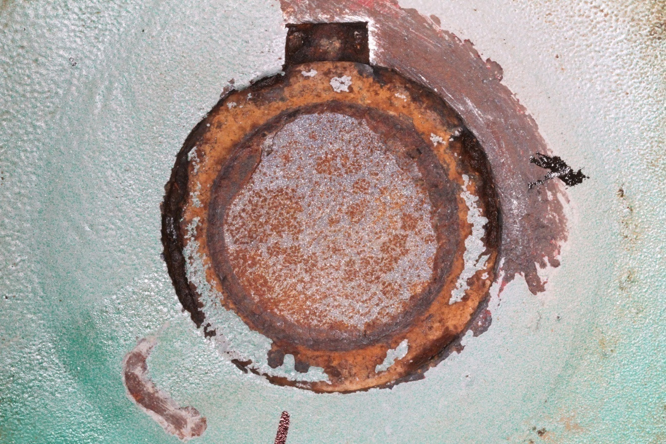 - Fissures de fatigue à la périphérie au point où l'axe change de diamètre. La présence de corrosion démontre que les fissures étaient présentes depuis un certain temps.