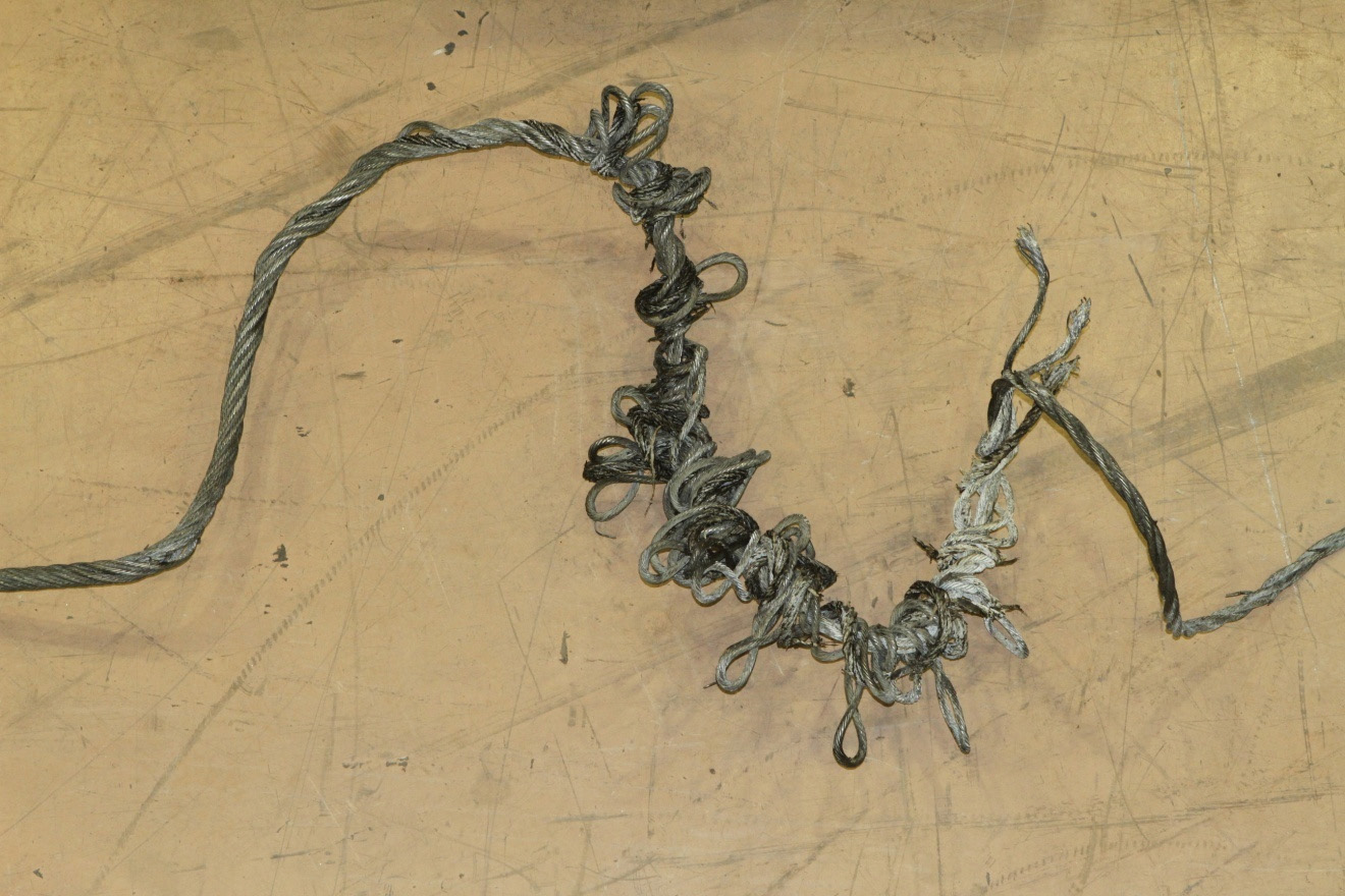 Les fabricants de câbles recommandent que les câbles métalliques soient remplacés lorsque le diamètre des torons extérieurs atteint le tiers de leur diamètre initial. Après une saison en service, tous les torons extérieurs du câble du côté est étaient usés ou endommagés à cause de la friction provoquée par les rouleaux des guides–câbles, dont le diamètre était de dimension inférieure aux normes. Le câble du côté est affichait une résistance résiduelle de 25 000 lb et sa charge de fonctionnement normale était estimée à 3 100 lb. Par conséquent, malgré un degré élevé d'usure, le câble du côté est affichait une résistance résiduelle correspondant à 8 fois la charge de fonctionnement prévue.