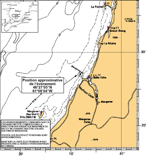 Le 1er mai 2010 à 6 h Note de bas de page 4, le bateau, avec à son bord 1 capitaine Note de bas de page 5 et 3 membres d'équipage, part de Margaree Harbour (Nouvelle-Écosse) pour se rendre aux lieux de pêche au homard situés à environ 1 mille marin en direction ouest-nord-ouest. Aucun des membres de l'équipage ne porte un gilet de sauvetage ou une combinaison d'immersion. Vers 6 h 05, l'équipage met à l'eau la première série de 5 casiers, en commençant par les casiers placés le plus près de la poupe. Initialement, 2 membres de l'équipage se tiennent debout sur le plat-bord arrière et mettent les casiers à l'eau en attendant qu'un espace soit dégagé sur le pont. Après que l'équipage a mis à l'eau la première série de casiers, le bateau progresse lentement vers l'emplacement suivant. Quelques minutes plus tard, pendant que le bateau vire lentement sur bâbord en prévision de la mise à l'eau d'une nouvelle série de casiers, il s'incline subitement sur bâbord. Comme le bateau prend de plus en plus de gîte, le capitaine essaie d'émettre un message de détresse sur les ondes du radiotéléphone VHF, mais il ne peut que transmettre le mot « Mayday »