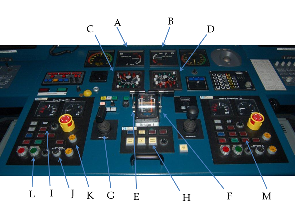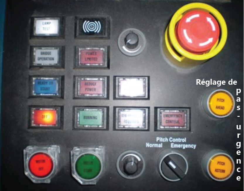 Sur le navire, le réglage du pas des hélices avant et arrière est commandé à partir de la passerelle utilisée au moyen des manettes respectives sur le pupitre de manœuvre (annexe B). L'énergie fournie à par chaque hélice varie lorsque les manettes sont déplacées. Les hélices fonctionnent de façon indépendante, mais sont toutes deux commandées par un système de gestion d'énergie.