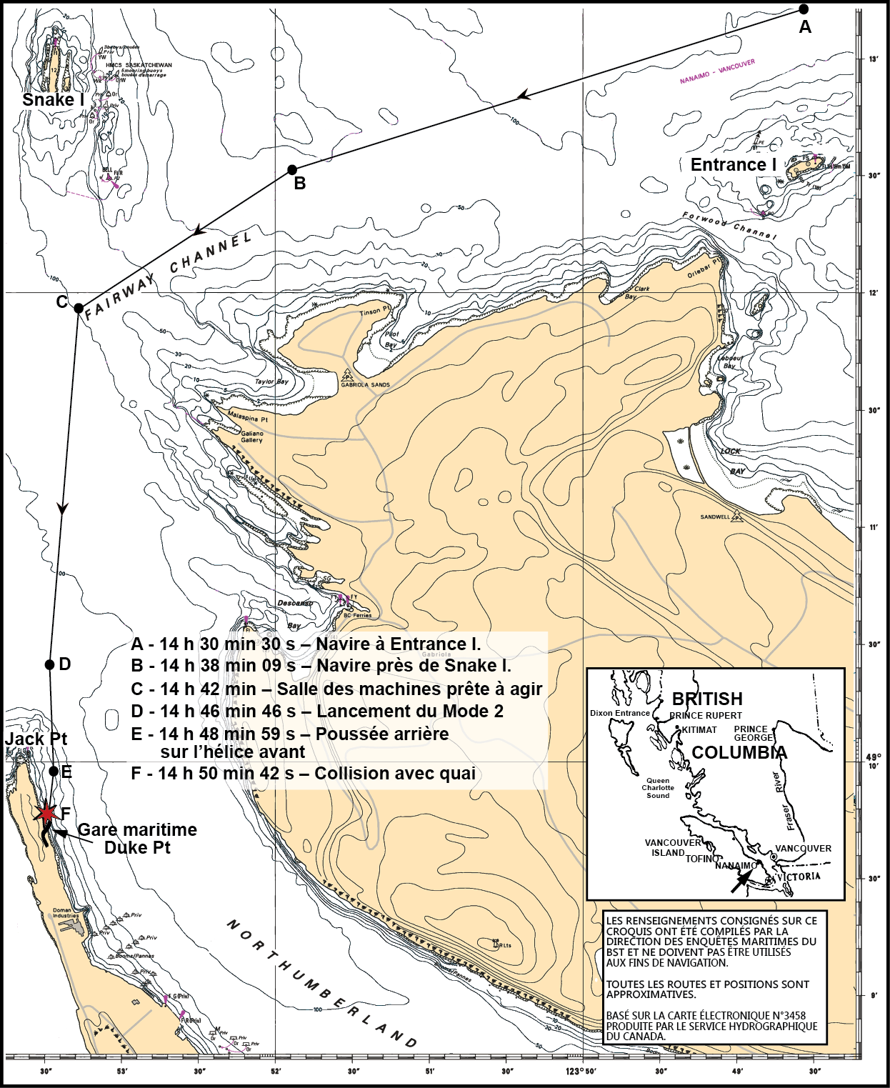 Après environ 45 minutes, le capitaine a passé les commandes à l'officier de quart avant de quitter la passerelle. La manette de l'hélice arrièreNote de bas de page 6 était réglée à 7,7 marche avant (annexe C), ce qui correspond à une vitesse de navigation d'environ 20 nœudsNote de bas de page 7. Vers 14 h 30, avant que le navire passe Entrance Island (annexe D), le capitaine en second est arrivé sur la passerelle pour remplacer l'officier de quart.