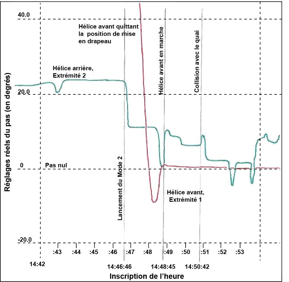 À 14 h 46 min 46 s, le navire se trouvait à environ 0,62 nm du poste à quai et voyageait à une vitesse de 19,5 nœuds. Le capitaine a de nouveau réduit le réglage du pas de l'hélice arrière à 4, en préparation pour le passage au Mode 2 (annexe E). Cette réduction du pas de l'hélice arrière appelle automatiquement le démarrage de l'hélice avant. Le capitaine a alors lancé le Mode 2 en appuyant sur le bouton START du tableau de réglage du pas et en a informé la salle des machines. La salle des machines a confirmé le passage en Mode 2.