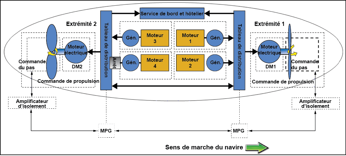 La Figure 1 montre le schéma du système de propulsion. La salle des machines contient 4 moteurs qui sont chacun couplés à une génératrice synchronisée (Gén.). La puissance électrique générée est acheminée vers 2 tableaux de propulsion de 6,6 kilovolts (kV), 1 à chaque extrémité du navire. Deux tableaux de distribution principaux de 600 V sont alimentés par ces tableaux de propulsion, via des transformateurs, et fournissent de l'énergie aux dispositifs auxiliaires. Les tableaux présentent 2 sections et une barre de liaison qui assure le raccordement électrique des 2 côtés de la salle des machines ou qui isole un côté de l'autre. Les tableaux de propulsion entraînent les moteurs électriques nécessaires à la propulsion. Le navire est propulsé par 2 moteurs électriques (DM1 et DM2), 1 à chaque extrémité du navire. Chaque moteur d'entraînement est pourvu d'un arbre porte-hélice et des composants connexes.