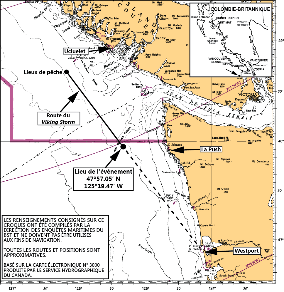 Le matin du 23 septembre 2012, le Viking Storm est retourné à Ucluelet (Colombie-Britannique) après un voyage de pêche (annexe A). Il y avait 4 membres d’équipage à bord du navire. Dès l’arrivée à Ucluelet, 2 des membres d’équipage ont quitté et 1 seul a été remplacé. Le matelot de pont a informé le capitaine de son intention de ne pas participer au prochain voyage et a quitté le navire après avoir aidé à décharger la prise. Un autre membre d’équipage est revenu d’un congé et s’est joint au navire. Le même jour, le capitaine a lui aussi quitté pour une durée prévue de 3 jours, et 1 des membres d’équipage existants a pris la relève. Vers 15 h, le navire a appareillé d’Ucluelet en direction des lieux de pêche avec le capitaine de relève, l’officier de pont-mécanicien et le membre d’équipage à son bordNote de bas de page 7.