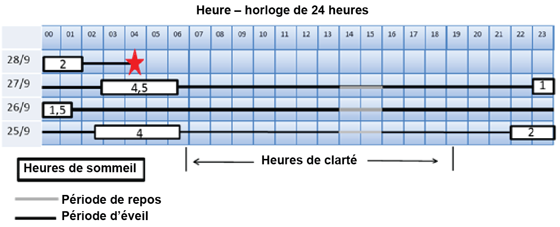- L’officier de pont avait le sommeil léger, mais il se sentait ordinairement complètement reposé après 7 heures de sommeil. Au cours des 3 nuits avant l’événement, il avait dormi respectivement 3 heures, 4,5 heures et 3,5 heures.