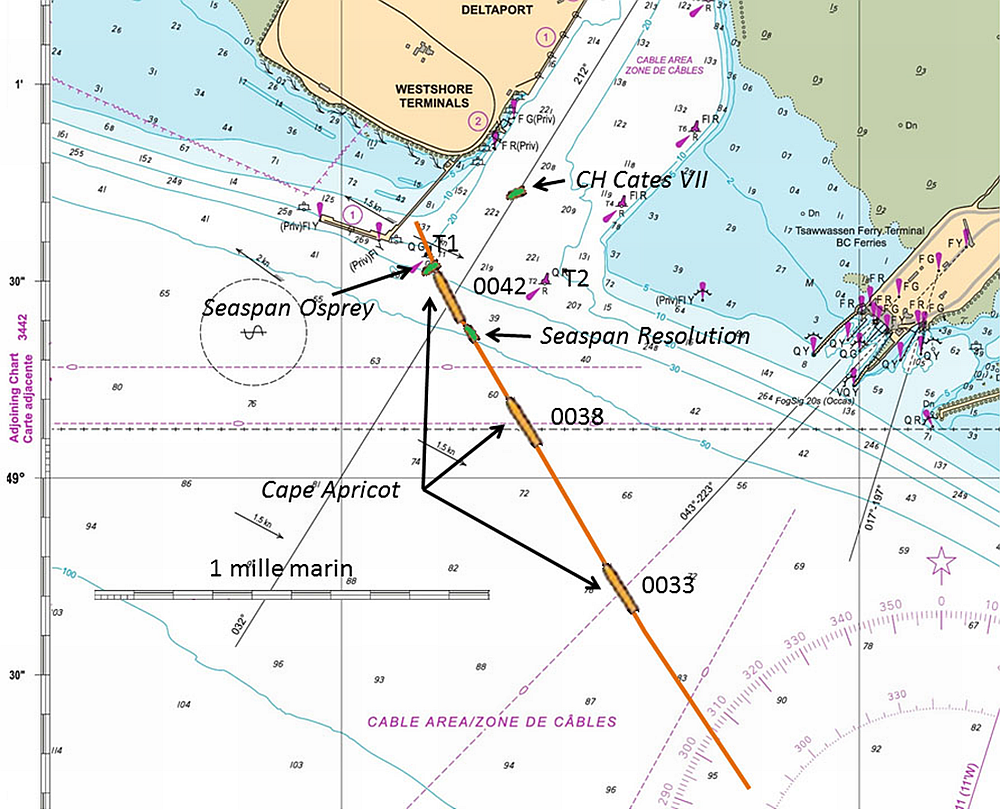 Trois remorqueurs devaient prendre en charge le Cape Apricot en vue de l’accostage : le Seaspan Resolution, le Seaspan Osprey et le C.H. Cates VII, lequel devait s’occuper des amarres. À 00 h 23, le Seaspan Resolution et le C.H. Cates VII ont quitté le bassin des remorqueurs pour aller à la rencontre du navire. À ce moment, le pilote a réussi à communiquer avec le Seaspan Resolution et à indiquer ses intentions. À 00 h 31, le Cape Apricot était à environ 1,4 nm au sud-sud-est du pont sur chevalets de Westshore Terminals. Le pilote a alors ordonné de stopper les machines. À 00 h 35, le troisième remorqueur, le Seaspan Osprey, a quitté le bassin des remorqueurs pour aller à la rencontre du Cape Apricot. À 00 h 38, le Cape Apricot se trouvait au sud de la bouée T2 Note de bas de page 8 et sa proue était à 5,2 encablures du pont sur chevalets (figure 1). Le Seaspan Resolution s’était positionné à la poupe. À ce moment, le navire avançait à 5,4 nœuds et gouvernait au 327 °G. Environ 1 à 3 minutes plus tard, lorsque le navire se trouvait à une distance de 1,9 à 0,5 encablure de la ligne de passage menant au bassin Note de bas de page 9, le pilote a ordonné de mettre la barre à tribord toute, mais le navire n’a pratiquement pas réagi. Lorsque cet ordre a été donné, le gouvernail était déjà à tribord toute. À 00 h 40, le pilote a fait un appel sur son téléphone mobile.