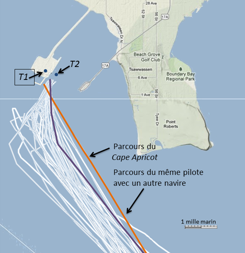 - Le parcours direct du Cape Apricot en direction de Roberts Bank exigeait un changement de cap plus prononcé vers tribord et plaçait le navire sur une ligne d’approche directe vers le pont sur chevalets.