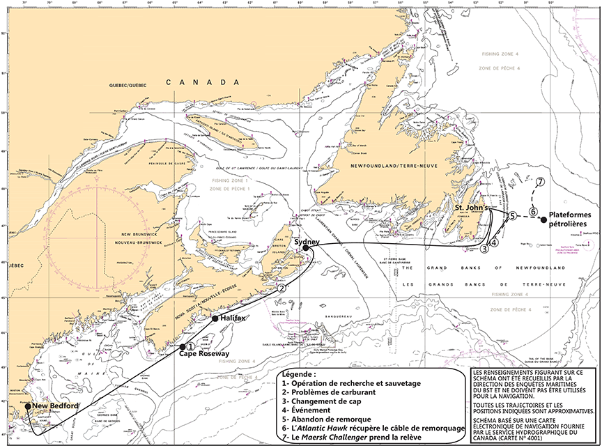 Le 3 décembre, le remorqueur a quitté Halifax pour se rendre à St. John’s. Cependant, à 12 nm du cap Canso, en Nouvelle-Écosse, la génératrice auxiliaire a éprouvé des problèmes de filtre à carburant. Le remorqueur a alors changé de cap pour se diriger vers Sydney (Nouvelle-Écosse) (Annexe A). Le navire est arrivé à Sydney le 4 décembre et l’équipage a réparé le filtre à carburant. Quatre jours plus tard, le navire a repris son voyage vers St. John’s.