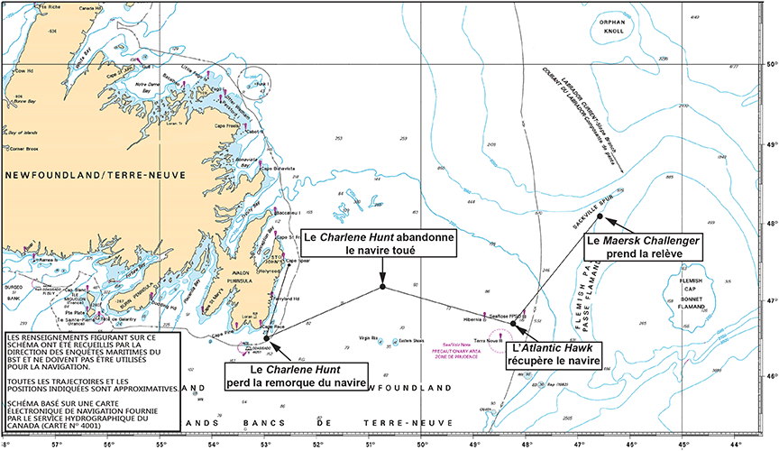 Le 23 janvier, vers midi, le Charlene Hunt a quitté le port de St. John’s, touant le Lyubov Orlova. Le capitaine de relève, le chef mécanicien, le mécanicien adjoint et 2 membres de l’équipage se trouvaient à bord. Vers 13 h, l’équipage a libéré le remorqueur d’assistance et laissé filer le câble de remorquage. Le remorqueur et le Lyubov Orlova ont ensuite progressé vers le sud pendant environ 18 heures, jusqu’à ce que le capitaine change de cap en virant de 50° à tribord. Après le changement de cap, le remorqueur a commencé à naviguer avec des vents de face d’environ 40 nœuds et une houle de 5 à 6 mètres. Le capitaine a réduit la vitesse et le remorqueur a parcouru 15 nm au cours des 9 heures suivantes. Le gros temps a persisté, et vers 14 h 45, le 24 janvier, le dispositif de remorquage qui rattachait le Charlene Hunt au Lyubov Orlova s’est rompu au large du cap Race (Terre-Neuve-et-Labrador), à la position 46°30' N, 53°04' W (Annexes A et Annexes B).