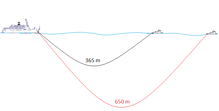 Le schéma suivant montre les variations de la caténaire en fonction de la longueur du câble de remorquage. Un câble de remorquage de 650 m absorbe une plus grande charge de choc maximale qu'un câble de 365 m.