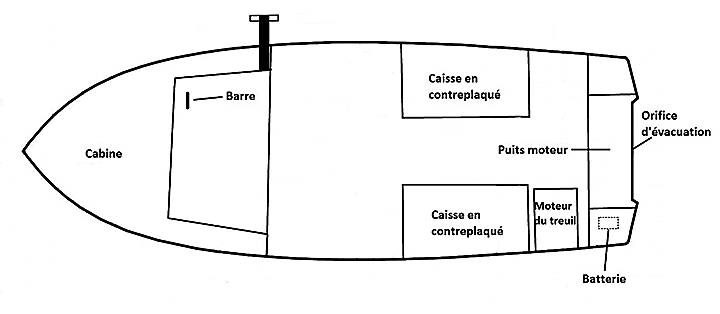 La coque était non pontée et il y avait 2 caisses en contreplaqué, 1 de chaque côté bateau, pour entreposer la récolte. Au moment de la pose ou de la remontée des casiers, l'équipage plaçait un morceau de bois sur les caisses et les utilisait comme plateformes pour les casiers. Un pont étanche à l'eau avait été aménagé à quelques centimètres au-dessus de la quille, créant une surface plane où l'équipage pouvait marcher. Dans le tableau arrière, un puits moteur servait de support aux moteurs hors-bords. La batterie, non protégée, reposait sur la hanche bâbord du pont sous le puits moteur (annexe A).