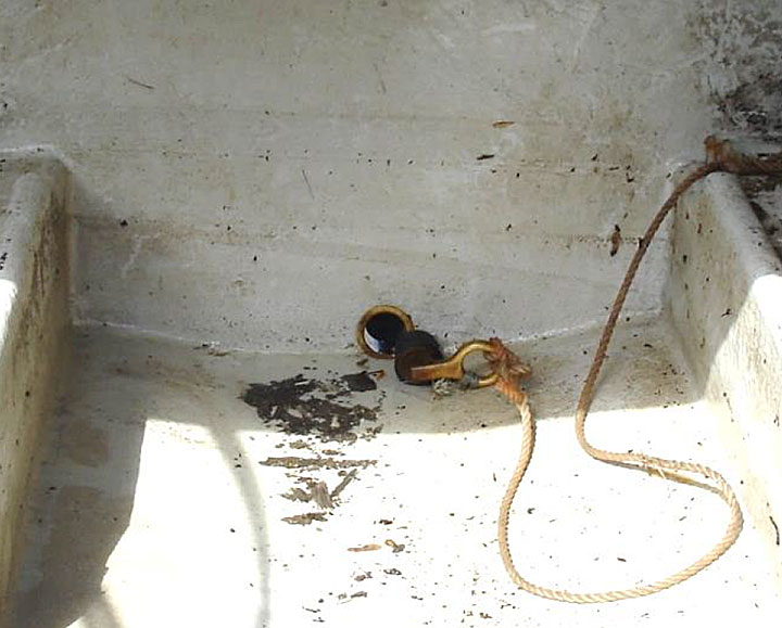 Le tableau arrière comportait un orifice d'évacuation de 3 centimètres doté d'un bouchon amovible (photo 2). L'orifice d'évacuation était sur l'axe central du bateau, tout juste au-dessus du pont, mais sous la ligne de flottaison. Pour évacuer l'eau accumulée à bord, l'équipage augmentait la vitesse du bateau jusqu'à ce qu'il planeNote de bas de page 3 et retirait le bouchon. L'eau sortait alors par l'orifice d'évacuation. Des seaux étaient conservés à bord et pouvaient servir d'écopes, si nécessaire.