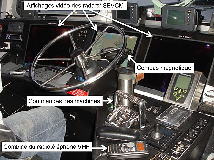 La passerelle intégrée comprend un ensemble de 3 écrans vidéo de 20 pouces capable d'afficher des renseignements de navigation provenant de 2 radars de marine et de 2 systèmes électroniques de visualisation des cartes marines (SEVCM) (annexe B). L'équipement de la passerelle comprend aussi 2 radiotéléphones très haute fréquence (VHF) avec appel sélectif numérique (ASN), un compas magnétique, un compas satellite, un pilote automatique, un échosondeur, une stationmétéorologique et un système d'identification automatique (SIA)Note de bas de page 4. Le bateau est aussi muni d'une corne de brume à commande manuelle, d'une caméra thermique et d'un avertisseur sonore automatique, mais ni la caméra ni l'avertisseur n'étaient fonctionnels au moment de l'événement.