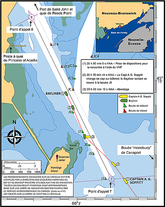 Juste avant 20 h 52, le Captain A.G. Soppitt entrait à 9,4 nœuds et se dirigeait vers la bouée de bâbord J7, tandis que le Bayliner sortait du côté ouest du chenal en passant près de la même bouée. Le capitaine du Bayliner a modifié sa route sur tribord et a réduit la vitesse pour s'éloigner du Captain A.G. Soppitt, qui s'approchait rapidement. À 20 h 52, les bâtiments n'étaient séparés que de 0,16 nm, mais les 2 capitaines ont poursuivi la manœuvre, chacun s'attendant à ce que l'autre change de cap sur l'est.