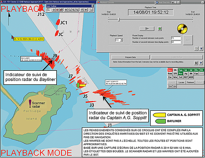 Entre-temps, au centre des SCTM de Saint John, l'un des officiers de Fundy Traffic en service se servait du radar pour surveiller les navires dans le chenal principal. Cependant, à 20 h 51 min 31 s, l'indicateur de suivi de position radar du Captain A.G. Soppitt a effectué une permutationNote de bas de page 18 avec un fouillis d'échos radar de sorte que l'appareil ne montrait plus la position exacte du bâtiment (annexe E). Treize secondes plus tard, l'indicateur de suivi de position radar du Bayliner a effectué une permutation avec l'écho radar de la bouée J9 de sorte que l'illustration de la position du navire est devenue elle aussi imprécise. À ce moment-là, l'officier de Fundy Traffic ne savait pas que ces permutations de cibles s'étaient produites.