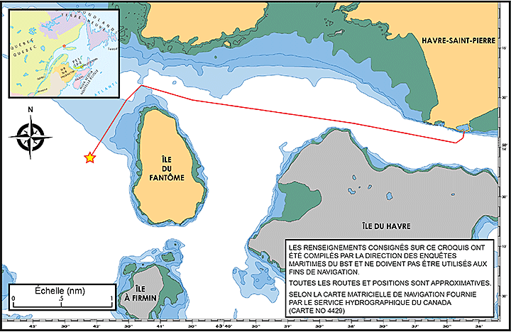 Après que le navire a franchi la pointe nord-ouest de l'île du Fantôme (annexe A), le capitaine a changé de cap pour faire route vers le sud sur une distance d'environ 0,8 mille marin (nm), lorsque le navire a soudainement perdu de sa puissance moteur. Le capitaine a poussé la manette des gaz plus loin vers l'avant pour reprendre la vitesse originale, et la puissance moteur a augmenté. Toutefois, peu après, la puissance du moteur a chuté de nouveau jusqu'à ce que le moteur s'arrête.