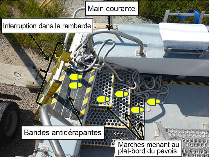 Le capitaine a aidé les passagers à monter à bord du radeau de sauvetage de tribord par le poste d'embarquement. Il a également donné l'ordre au matelot d'assumer la responsabilité du radeau de sauvetage de bâbord. Avec l'aide de l'un des passagers, le matelot a aidé les passagers à monter à bord du radeau de sauvetage de bâbord. Pour ce faire, les passagers devaient monter sur un banc en bois amovible, enjamber la rambarde du navire, puis descendre environ 1,5 m pour atteindre le radeau de sauvetage (annexe B).