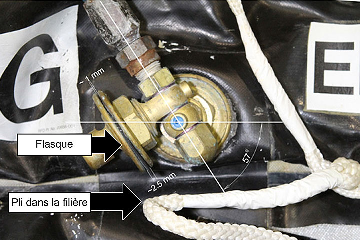 • Le clapet de gonflage s'était arraché du tube de flottabilité inférieur, et l'ouverture pratiquée dans le tube pour recevoir le clapet était déformée.