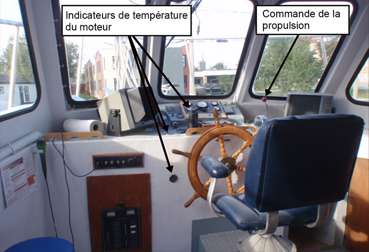 Le pupitre de navigation inclut un compas magnétique, un radar et un radiotéléphone à très haute fréquence (VHF). Le tableau de contrôle du moteur, situé devant le poste de conduite, comporte divers indicateurs de paramètres moteur (ex. : huile, tension, tr/min, température). Le pupitre de navigation présente 3 indicateurs de température du moteur : 1 sur le tableau de contrôle du moteur, 1 situé à gauche de la barre et 1 placé à hauteur des genoux (photo 2). Ces indicateurs montrent la température du liquide de refroidissement du moteur. Le pupitre comprend également un système de détection d'incendie qui comprend une alarme sonore et visuelle qui est activée par un détecteur de chaleur situé dans le compartiment moteur. Le détecteur a été installé sur la cloison arrière du compartiment moteur, le plus loin possible du moteurNote de bas de page 1. La commande de la propulsion se trouve à droite du tableau de contrôle du moteur.