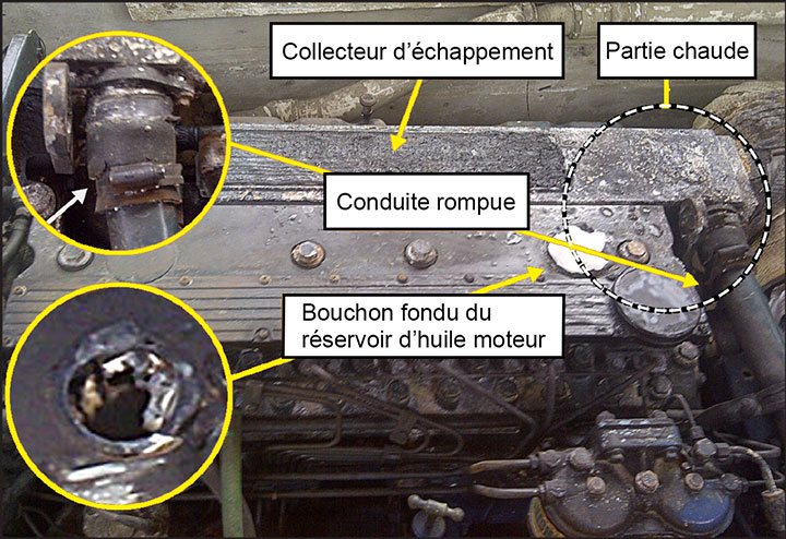 L'enquête a déterminé que le moteur avait perdu son liquide de refroidissement lorsqu'une conduite en caoutchouc raccordée au collecteur d'échappement s'est rompue (photo 3), fort probablement en raison d'usure. Sans liquide de refroidissement, le moteur a surchauffé et, après un certain temps, une fissure  s'est créée entre le collecteur d'échappement et sa chemise d'eau de refroidissement. La conduite endommagée et la fissure dans le collecteur ont dirigé les gaz d'échappement chauds contre la face intérieure du couvercle du compartiment moteur, qui était recouverte d'isolation thermique acoustiqueNote de bas de page 6. Cette isolation consistait en 2 couches de mousse de polyuréthane, avec une couche de vinyle entre les deux, recouvertes d'une pellicule de Mylar aluminisé. Ce type d'isolation offre une certaine insonorisation et protection thermique, mais n'offre aucune protection en cas de contact direct avec une source de chaleur ou lorsque la capacité réfléchissante de la pellicule est compromise. Les gaz chauds ont endommagé la pellicule, ce qui a exposé les couches de mousse. En outre, le bouchon du réservoir d'huile moteur a fondu, et le moteur a aspergé de l'huile sur la mousse. La combinaison de mousse imbibée d'huile et de chaleur provenant de la fuite de gaz d'échappement a causé l'incendie.