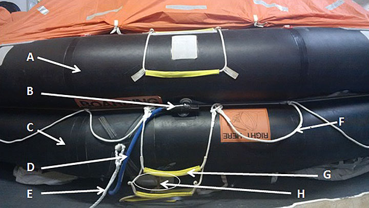 2. Deux des 3 radeaux de sauvetage ne se sont pas gonflés complètement à cause de déchirures dans les tubes de flottabilité autour des clapets de gonflage. Ces déchirures ont peut-être été causées par les filières emmêlées autour des ensembles de clapet de gonflage, ce qui aurait appliqué une tension excessive sur les tubes.