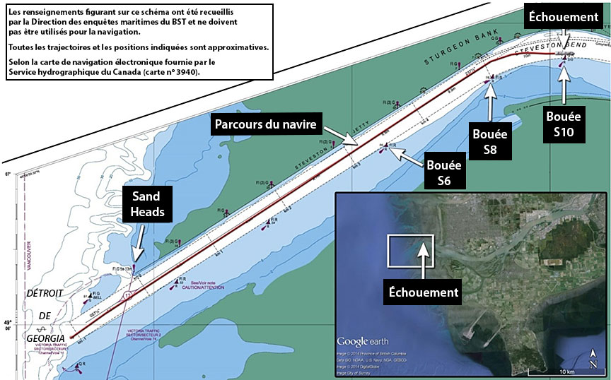 À 21 h 53 min 20 s, la bouée S8 se trouve presque au centre du navire, le cap du navire est à 065° gyro (G), son taux de giration est de 24,8° par minuteNote de bas de page 12 à tribord à une vitesse de 14,3 nœuds. À 21 h 54 min 30 s, le cap est à 089°G, la vitesse est de 13 nœuds et le navire commence à tourner vers le bras sud du chenal. Le pilote ordonne un retour de barre bâbord en avant toute pour arrêter le virage à tribord et corriger la position du navire dans le chenal. Le navire ne répond pas suffisamment et s'échoue juste au nord de la bouée S10, à 21 h 56, dans le chenal navigable.